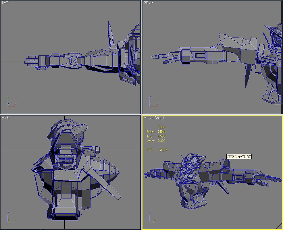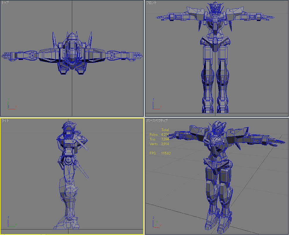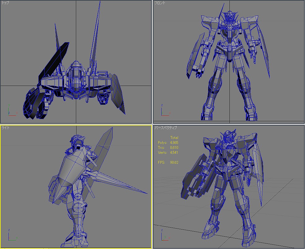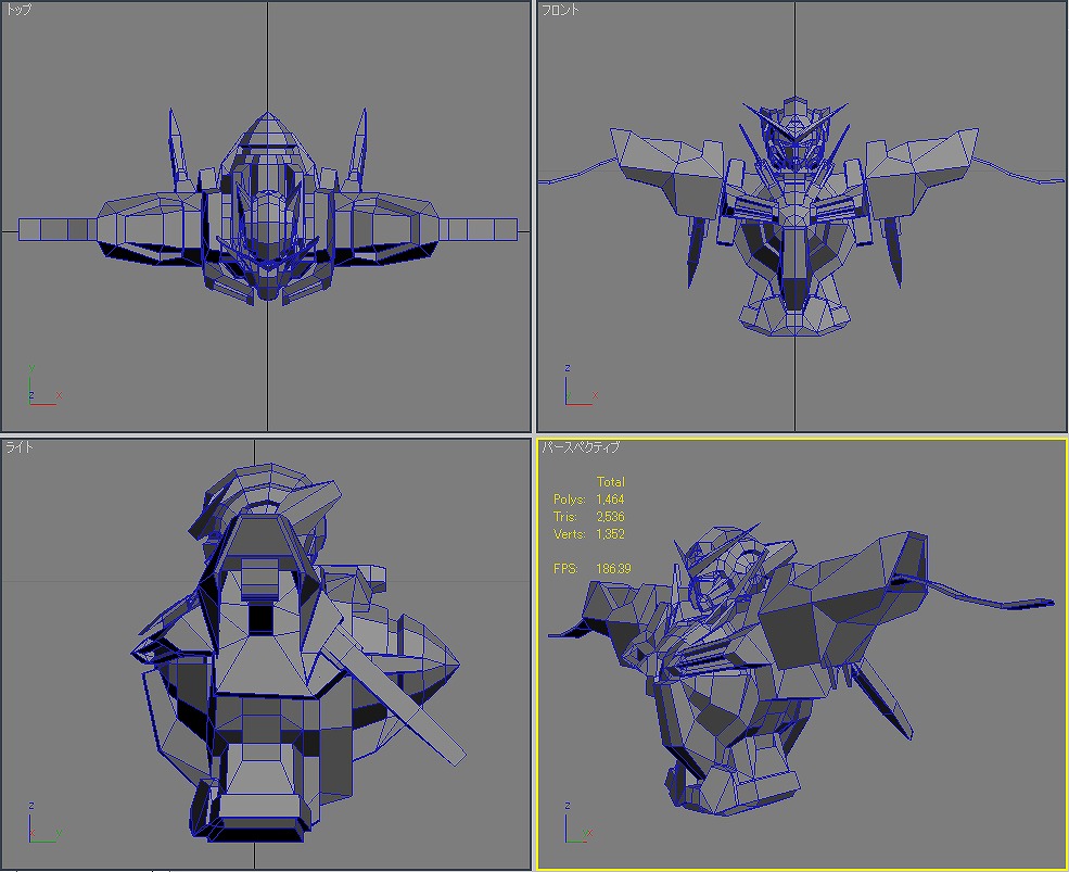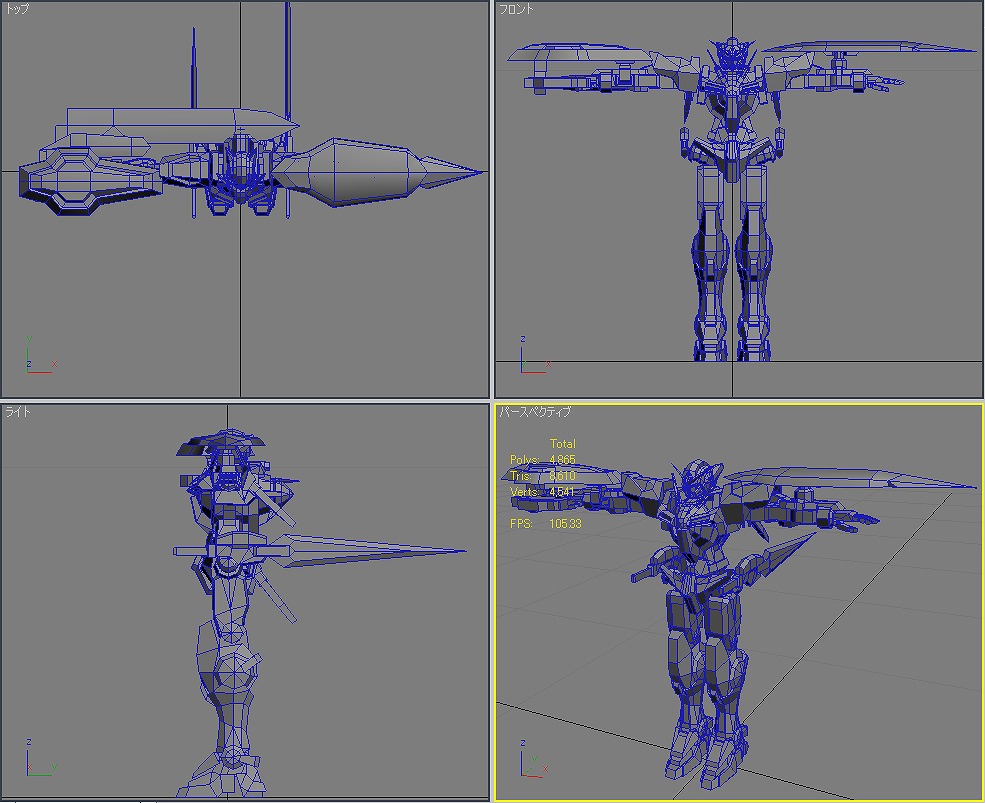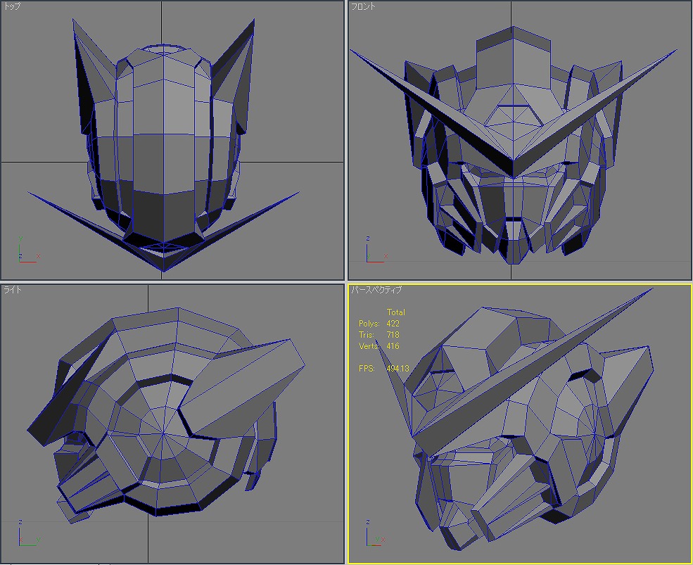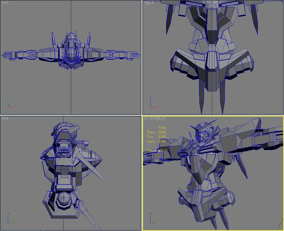 本当にラストスパートかけるときは大変だ。 時間が足りな過ぎると思って寝る時間を削ると、今度は体調不良で無駄な時間を使ってしまう。 寝不足だと本当に頭が回らない。 睡眠は大切だ。 メダOG ほんと進まなくて最近イライラがたまる。 でも、メダ自体はすでに80体近くまで打ち終わっているから後は、効果音探しとかいろいろだけど。 エフェクトも作り直しだし。 そんな忙しい中3Dの練習も何とかやってた。 毎日15分だけのモデリング。 お題は機動戦士ガンダム00のガンダム「エクシア」 一応△5000以内を目指したものの、あっさり超えてしまい△8610まで膨れ上がってしまった。 頭部 体 腕 腰 脚 武装 ポージング とりあえずは全体像は作れた。 残るはボーンの設定とUV展開、テクスチャ作成、ライティング。 なんかめんどくさくなってきた。 でも、やらないと忘れてしまうからやらなくては。 R3さん&ねもやんさん 毎度どうもです。ここしばらく仕事ばかりでなかなか更新のタイミングが… 早くメダがプレイしたい。早期購入者にカードが付いてくると聞いてやる気UPしてますw 社会人になってから初の年末商戦。 ねもやんさん iwao loverさん 遅い返信であれですけど、情報ありがとうございます。